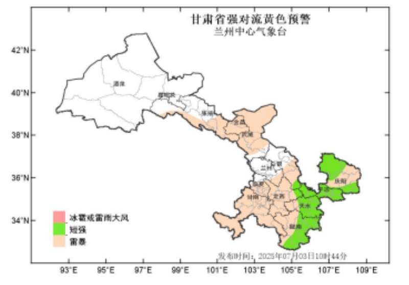 蘭州中心氣象臺(tái)2025年7月3日10時(shí)44分繼續(xù)發(fā)布強(qiáng)對(duì)流黃色預(yù)警:預(yù)計(jì)未來24小時(shí),張掖、金昌、武威、蘭州、白銀、甘南、臨夏、定西、隴南、天水、平?jīng)觥c陽等州市有雷暴,其中隴南、天水、平?jīng)?、慶陽等市部分地方及白銀、定西兩市局部地方有短時(shí)強(qiáng)降水,最大小時(shí)雨強(qiáng)20-60mm;隴南、天水、平?jīng)?、慶陽等市強(qiáng)降水在未來24小時(shí)內(nèi)多發(fā),白銀、定西主要強(qiáng)降水時(shí)段在4日2-8時(shí)。請(qǐng)注意防范!