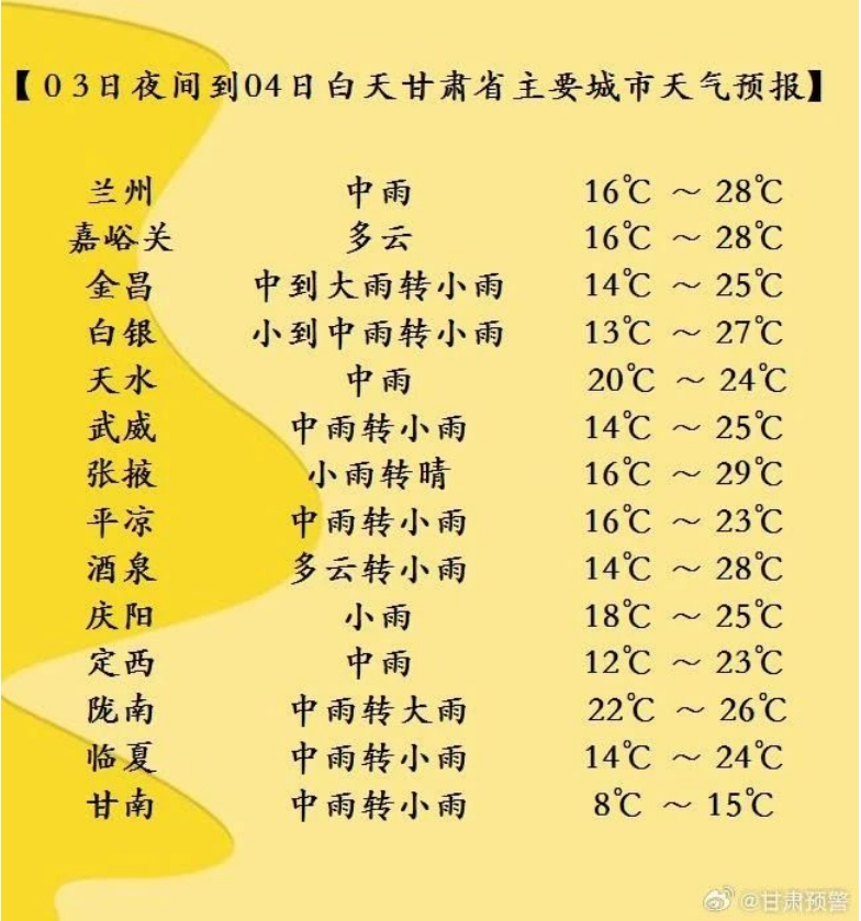 今天夜間到明天白天(7月3日20時(shí)-7月4日20時(shí)),酒泉、嘉峪關(guān)、張掖三市多云間陰,局部地方有小雨,祁連山區(qū)有中到大雨;省內(nèi)其余地方陰有小到中雨,其中隴南、天水、平?jīng)觥c陽等市局部地方及定西、甘南兩市州東部、白銀市南部有暴雨。