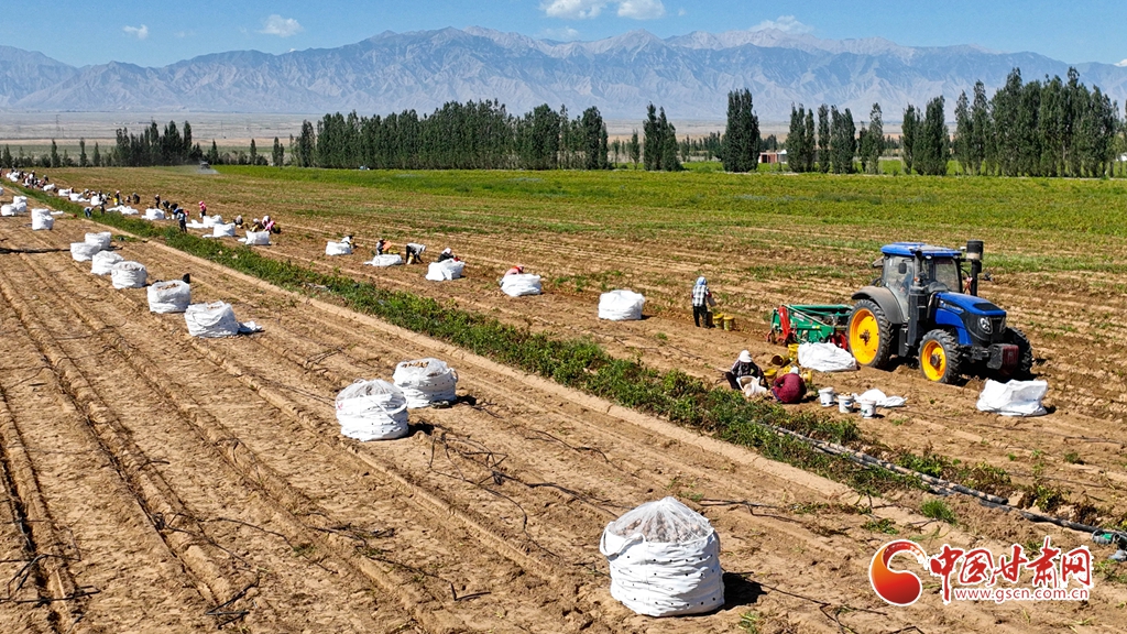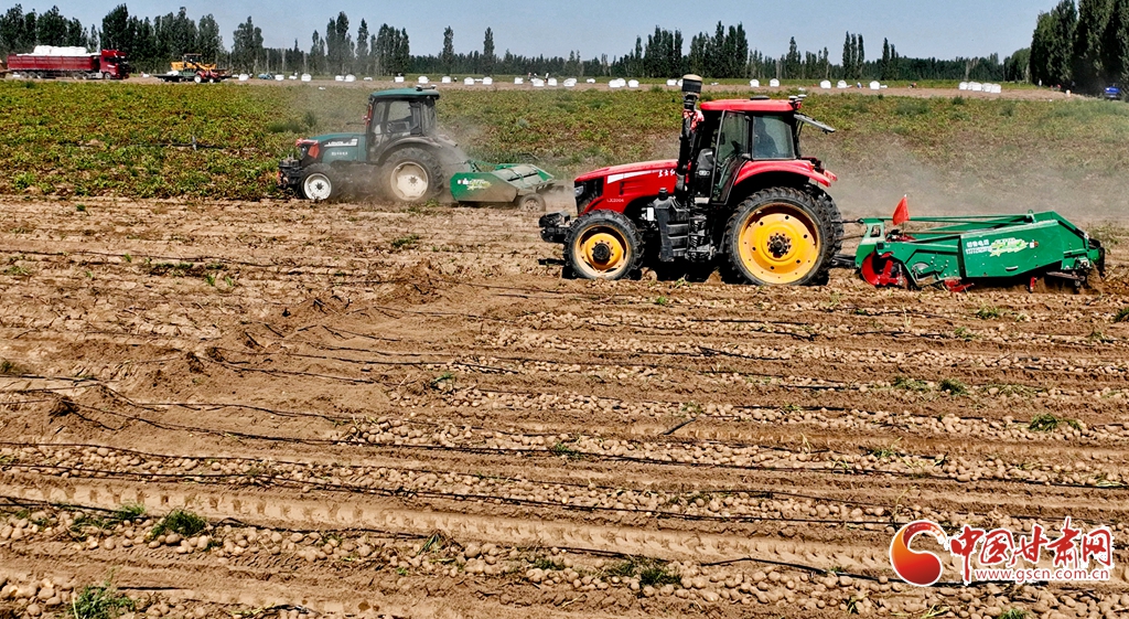 8月14日,祁連山下的張掖市高臺縣新壩鎮(zhèn)馬鈴薯種植基地一片繁忙。收獲機在田間穿梭,碩大的馬鈴薯破土而出,工人們正加緊進行撿拾、分揀和裝車。