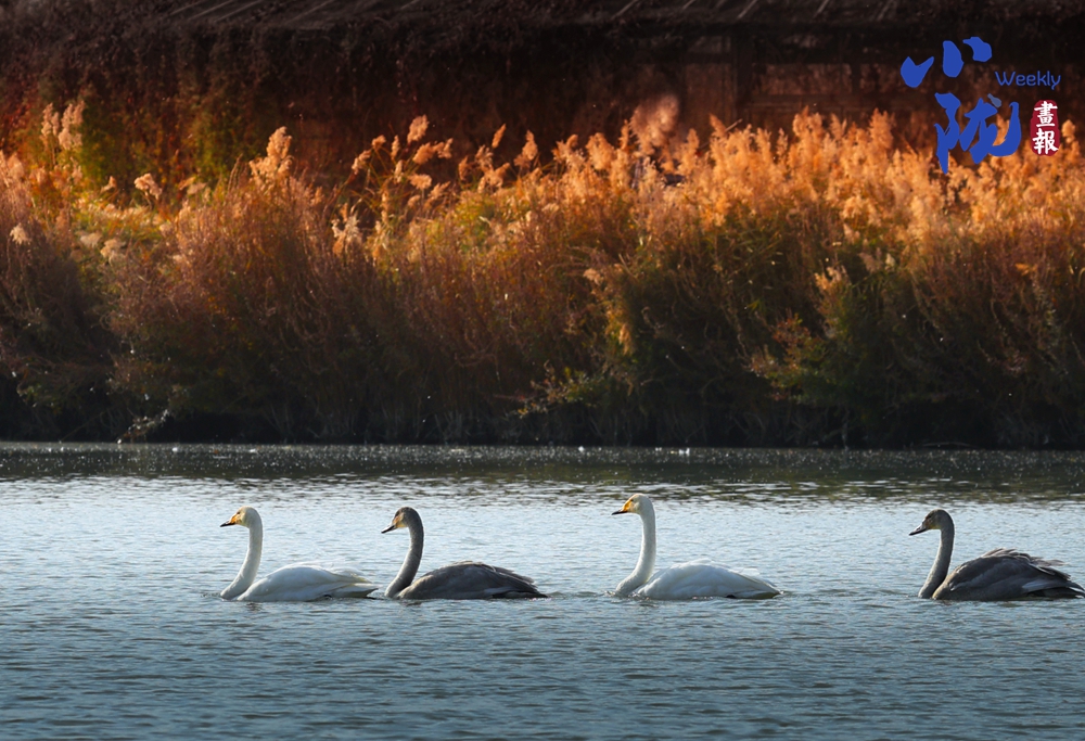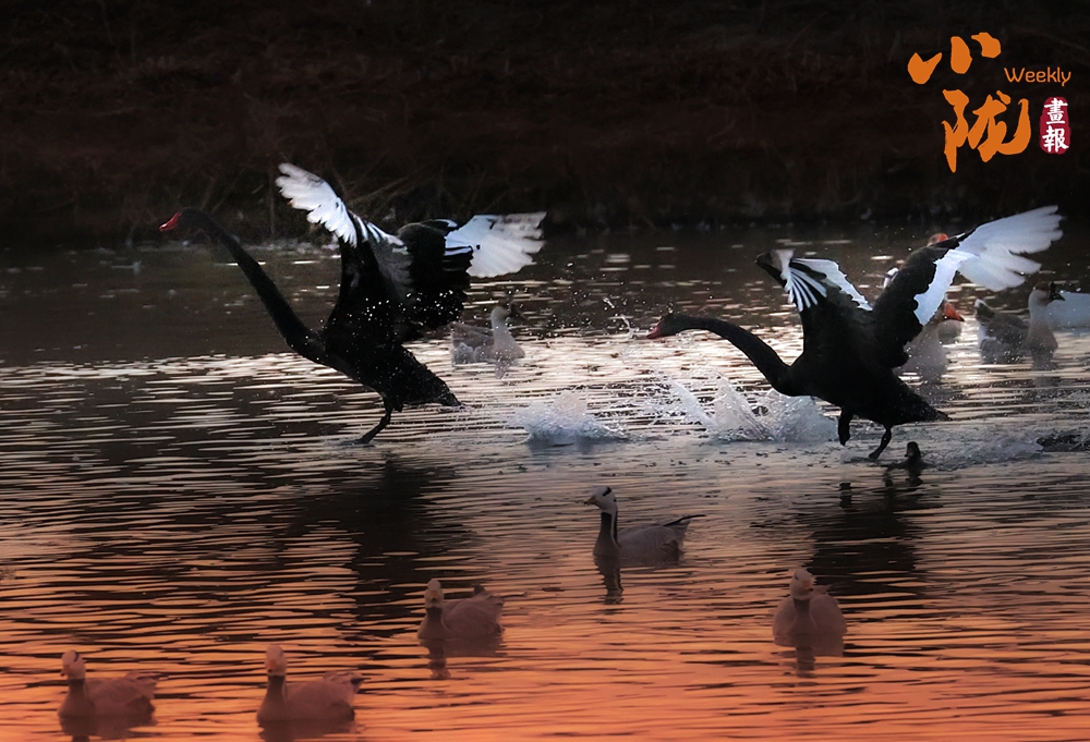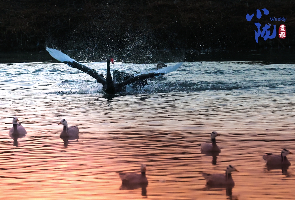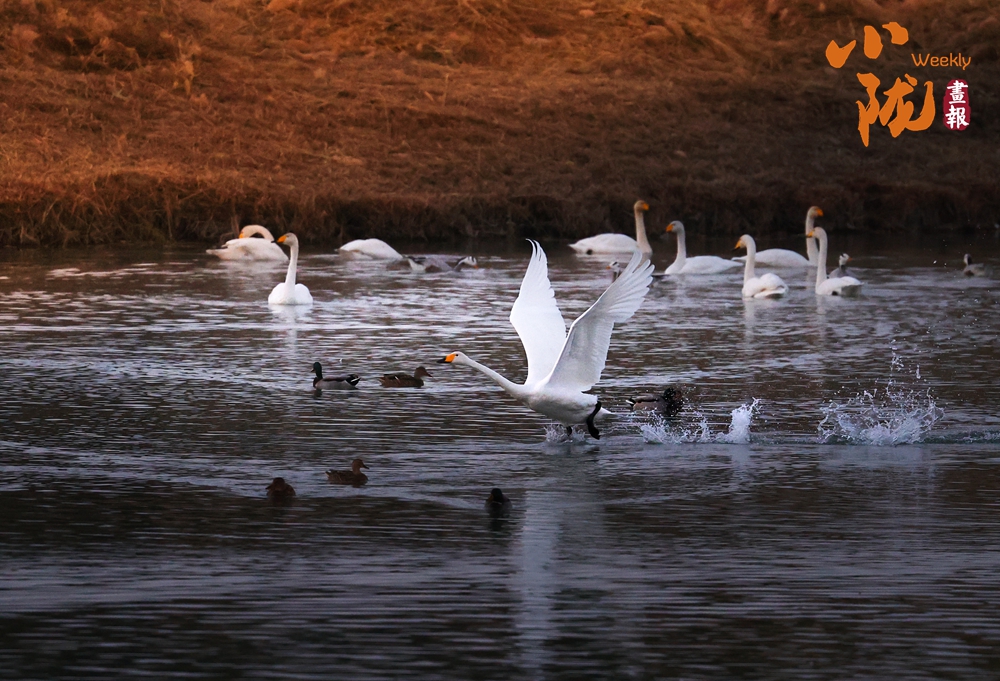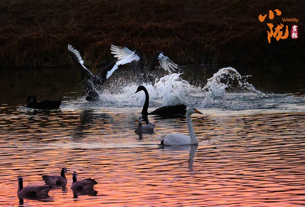 這里聚集了天鵝、赤麻鴨、灰雁等多種水鳥(niǎo),它們?cè)邳S昏里愜意地游弋,或扎進(jìn)水里捕魚(yú),或相互追逐戲水的畫(huà)面,既震撼又溫柔,成為攝影愛(ài)好者和游人爭(zhēng)相追逐的“冬日奇景”。
