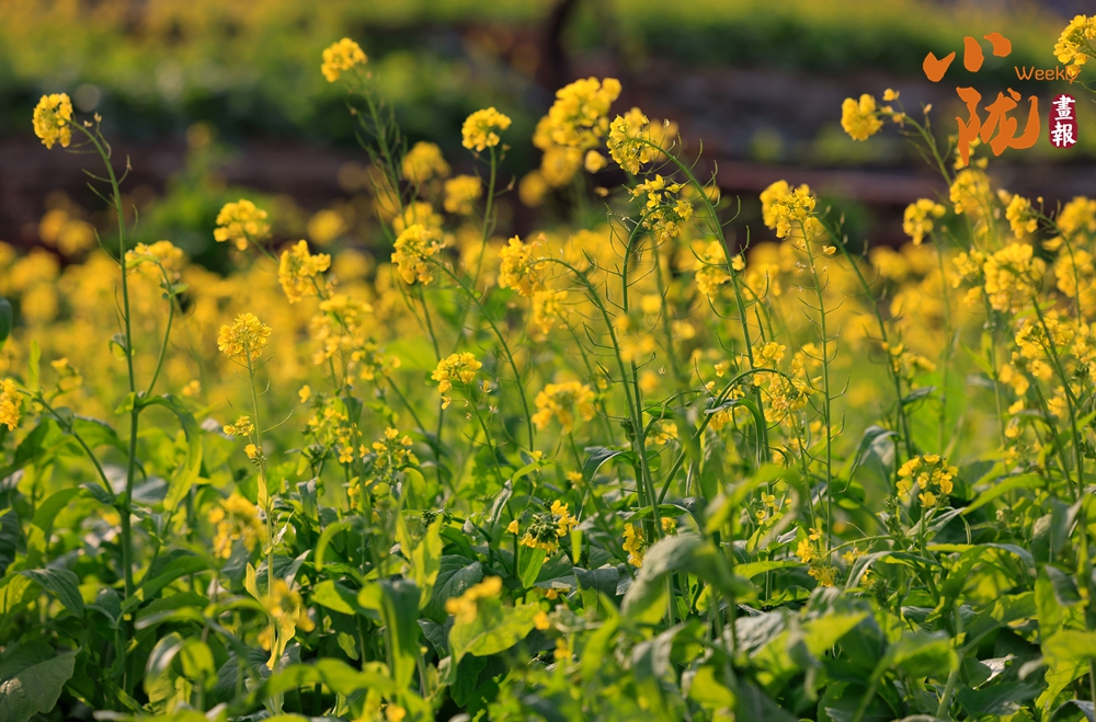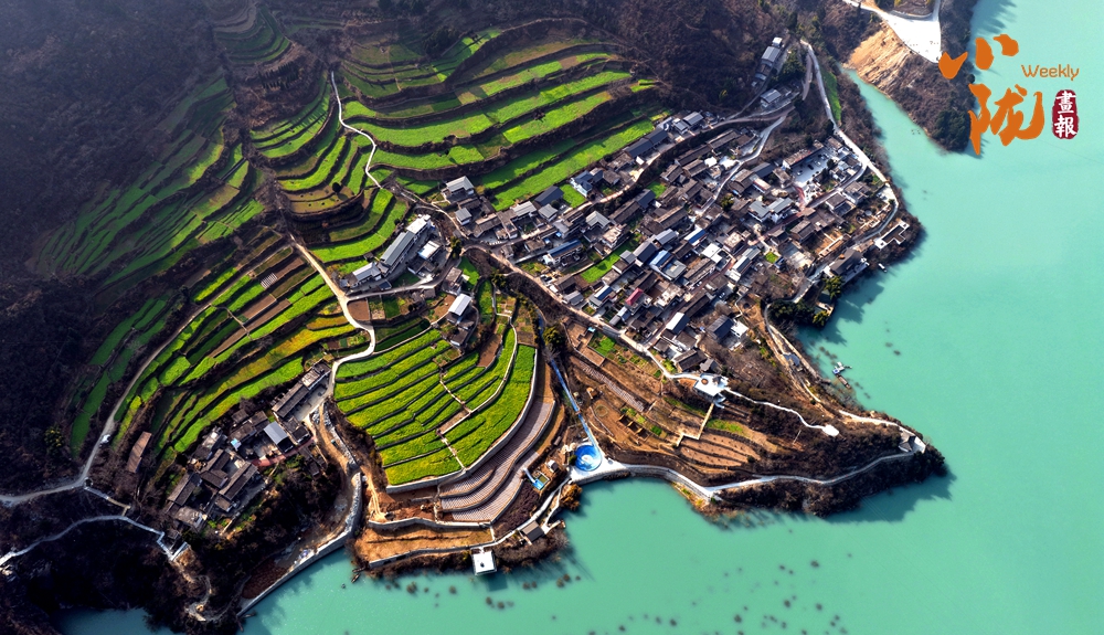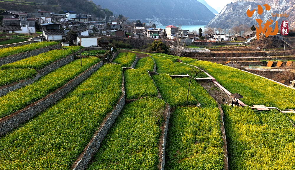 那一叢叢、一簇簇的油菜花,沿著梯田層層疊疊,從江邊一直蔓延到半山腰,鋪展在青山碧水之間;又像是大地剛剛蘇醒時,打翻的調(diào)色盤。